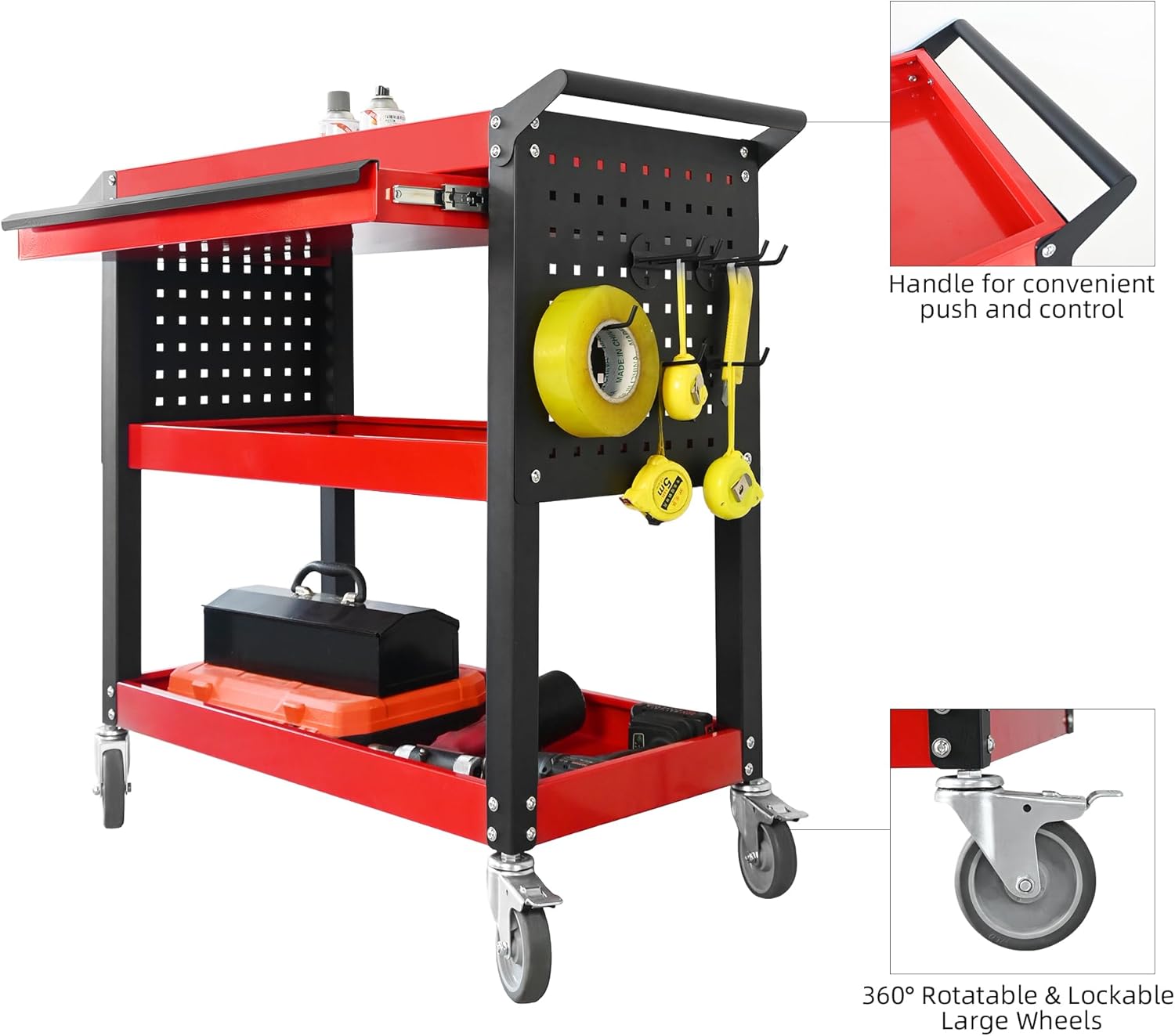 3 Tier Tool Cart on Wheels, Heavy Duty Metal Rolling with Drawers and Pegboards, 660 LBS Load Capacity Tool Storage Cart, Industrial Utility for Garage, Warehouse, Workshop