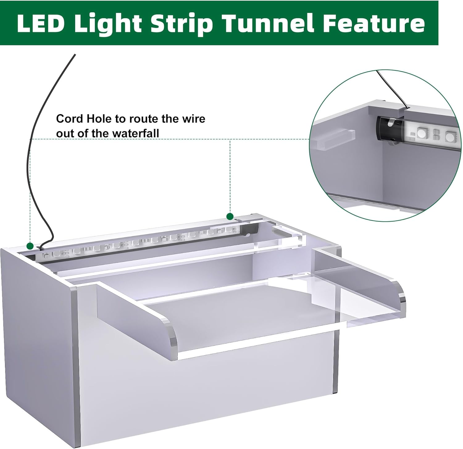 - 【Enhanced Upgrade Design】- This upgraded design includes a specialized channel for the LED light strip and two cable outlets to neatly route power cables, keeping them hidden from view. Ideal for those who want to add an LED light strip separately. To further enhance functionality and efficiency, a splash guard has been integrated at the open top of the waterfall. Additionally, a precisely positioned baffle at the water inlet ensures regulated and optimized water flow, creating an appealing visual effect while reducing unwanted splashing.