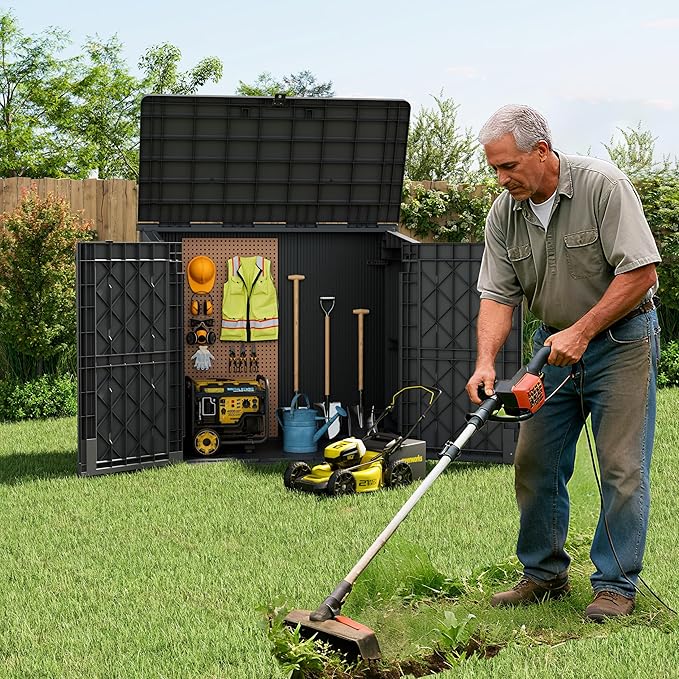 - DUAL PANELS - The outdoor storage shed is made of double-layer resin panels, which are treated with advanced technology to provide stronger wind and impact resistance; not easy to bend or puncture; can safely store valuable tools and equipment.
