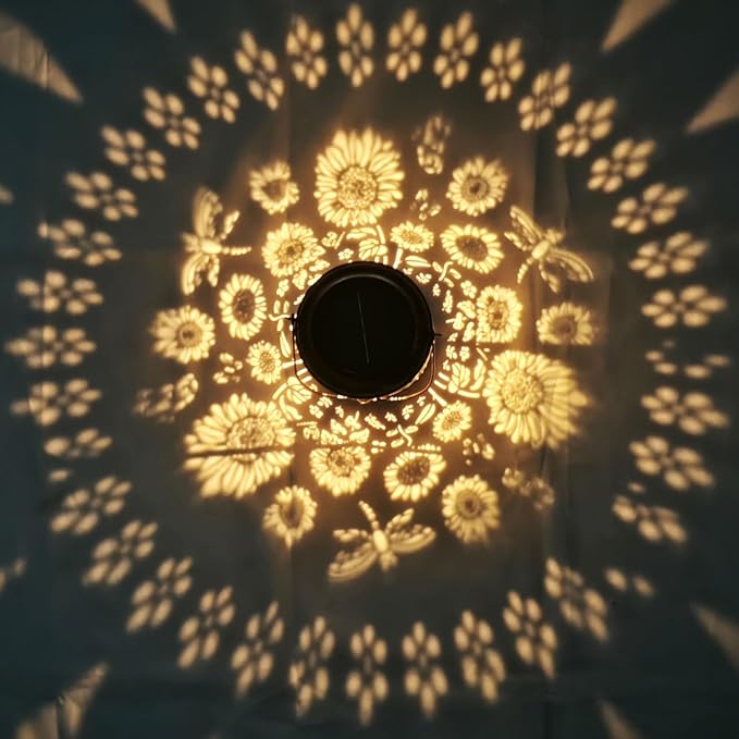 - EXQUISITE PATTERN: hanging solar garden lantern dragonfly butterfly light adopts retro hollow design with warm light with sunflower pattern, casting beautiful patterns on the wall or lawn, christmas gifts for family mom women grandma birthday,sister,friendship and friends during holidays.Size: 4.3"H x 4.3"W x 6.3"L.