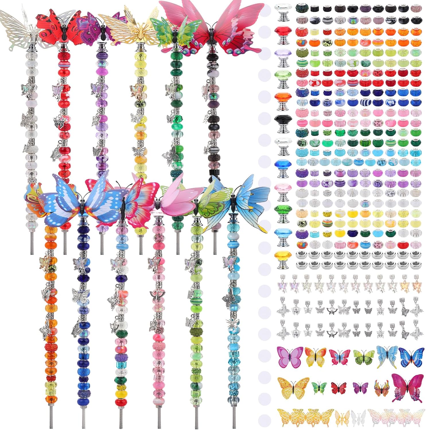 380pcs Beaded Garden Stake, DIY Butterfly Fairy Wand Garden Stake Kit with 10IN Threaded Rod Crystal Stopper Top Large Holes Beads Butterfly Decoration Pendants Outdoor Fairy Garden kit