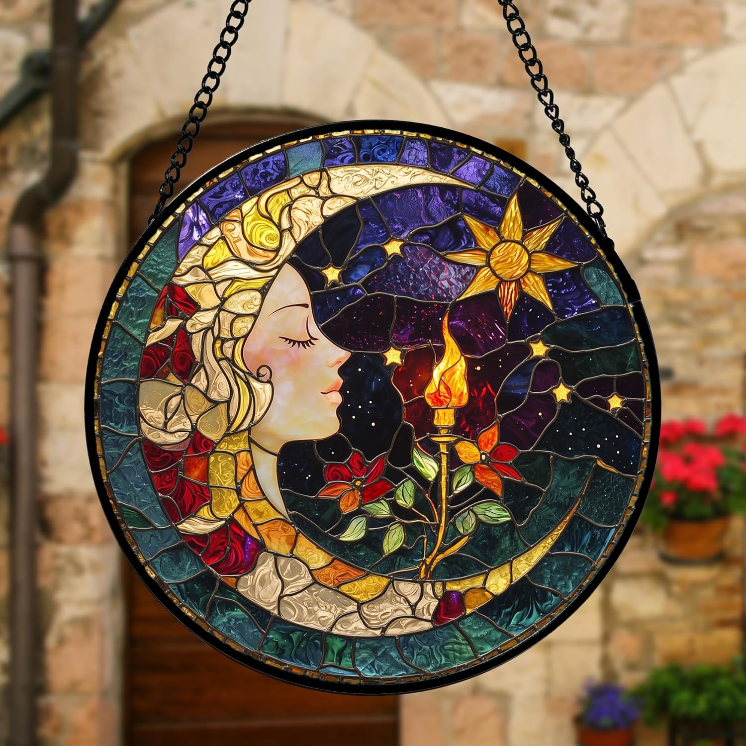 - Versatile and Easy to Hang: This stained glass window panel is a breeze to install with its included metal chain. Beautiful patterns are the perfect addition to your windows, doors, and home.