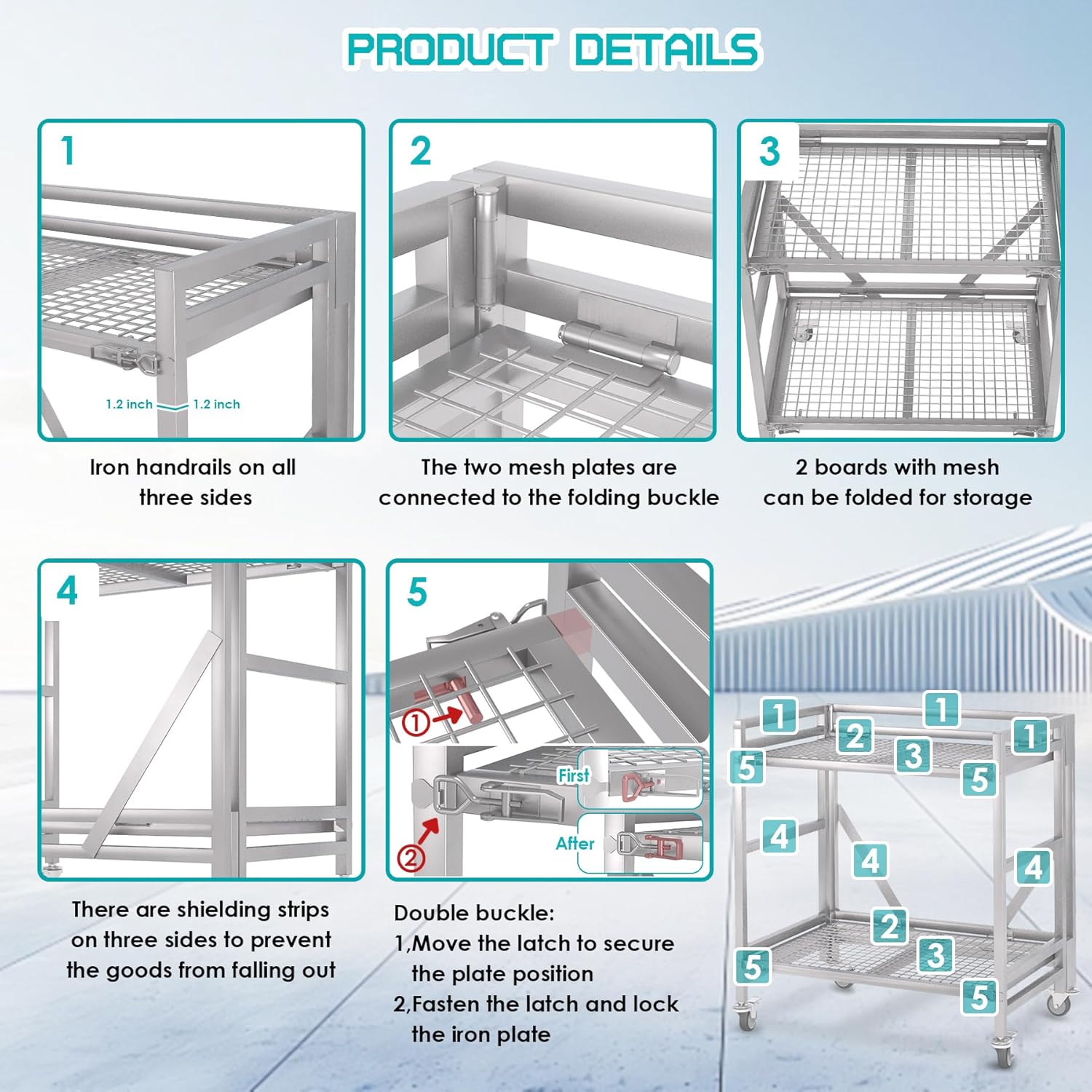 - 【Double-layer folding design】 The double-layer rolling cart adopts a unique foldable bolt design, and the two-layer shelves can carry items such as flower pots, water buckets, cardboard boxes, etc. The folded thickness is only 5.5 inches, which doesn't take up much space and can be placed in any corner of the room. Easy to use, just three steps to open for work, it's a practical tool in everyday life