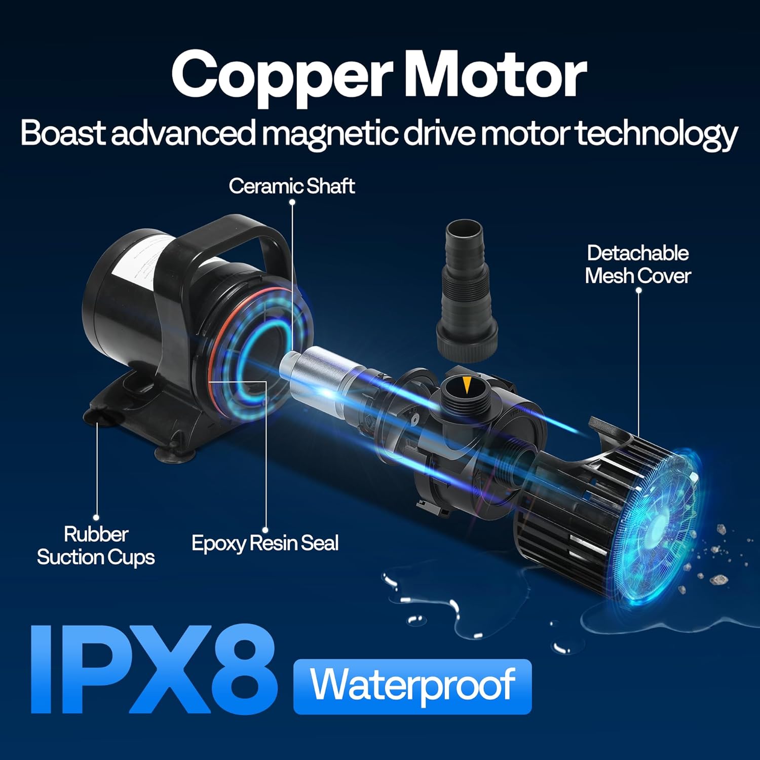 - DURABLE MATERIAL: Constructed with a sturdy ABS housing, high-quality copper motor, and a ceramic shaft, this koi pond pump is built for exceptional durability; The motor is sealed with epoxy resin, providing superior water resistance (IPX8) and insulation performance; The included nylon barrier bag effectively prevents stones and debris from entering the pump, ensuring smooth and reliable performance