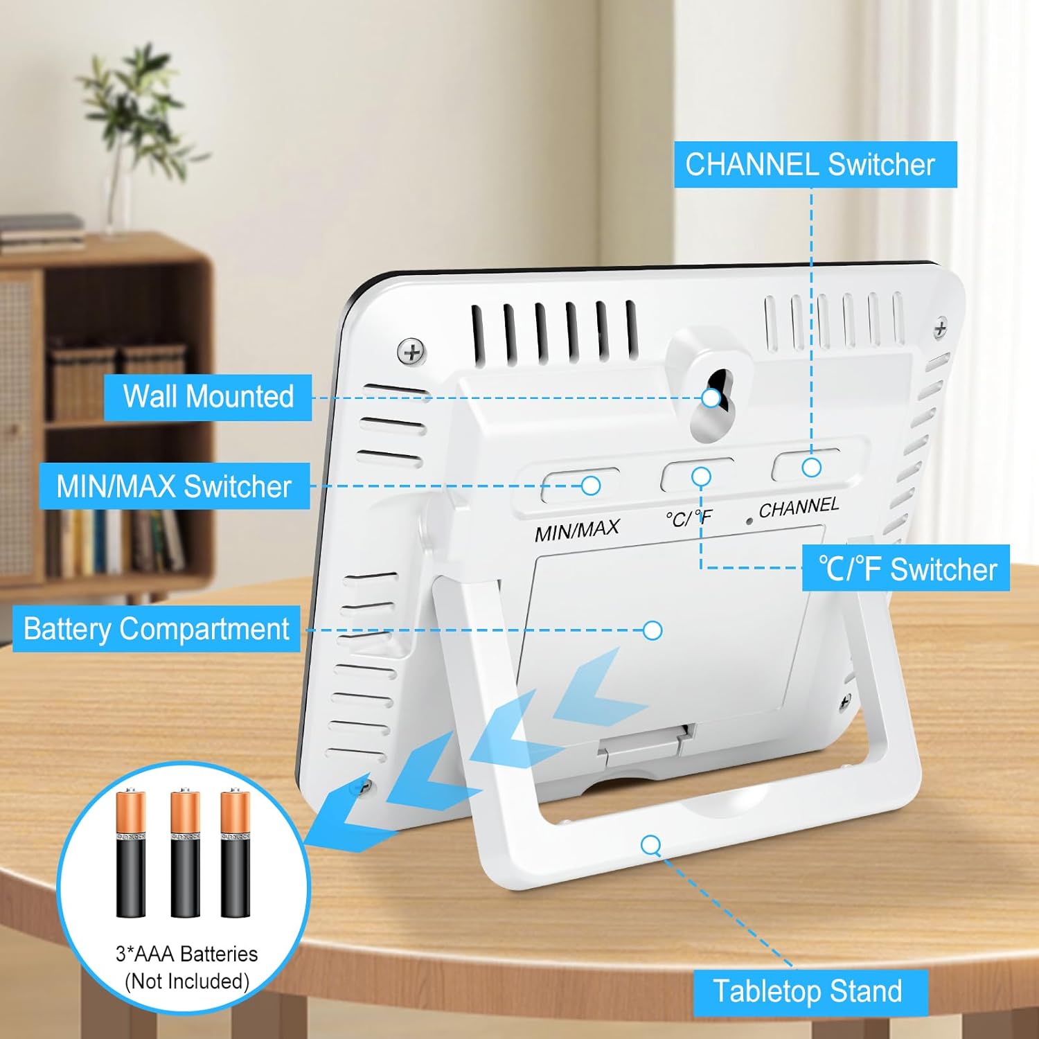 - Wireless Remote Sensor: With 3 remote sensors, temperature and humidity information can be monitored in multiple areas of your home at the same time. such as bedroom, kitchen, greenhouse, garage, nursery, etc. The wireless sensors have a transmitting range of 328 feet/100 meters in open areas