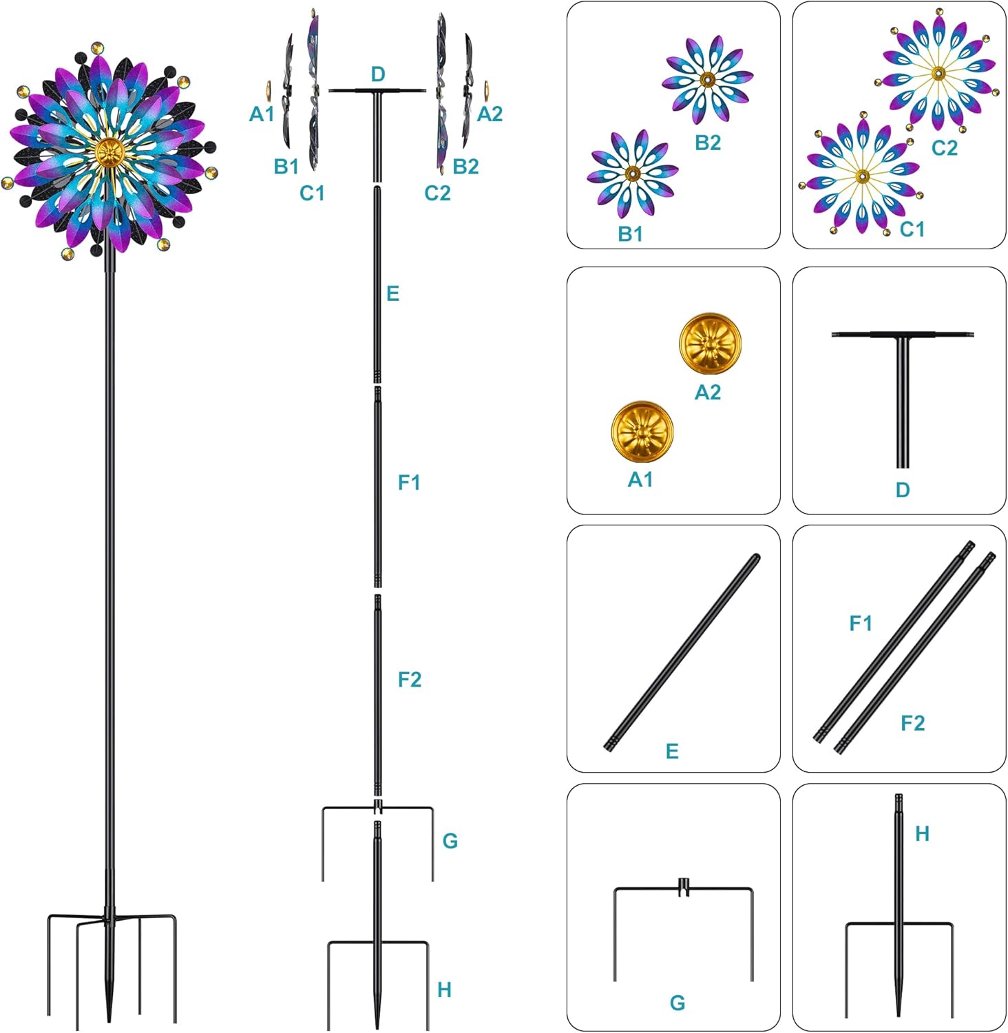 - DOUBLE LAYER WIND SCULPTURE & SPINNER: Garden wind spinners have double layer wind sculpture on each side, two-way wind movement with high quality low friction bearings for 360 degree rotation at low wind speeds. Oversized 13" Dia * 63" High, make your wind spinners stand out in your garden for an otherworldly view.
