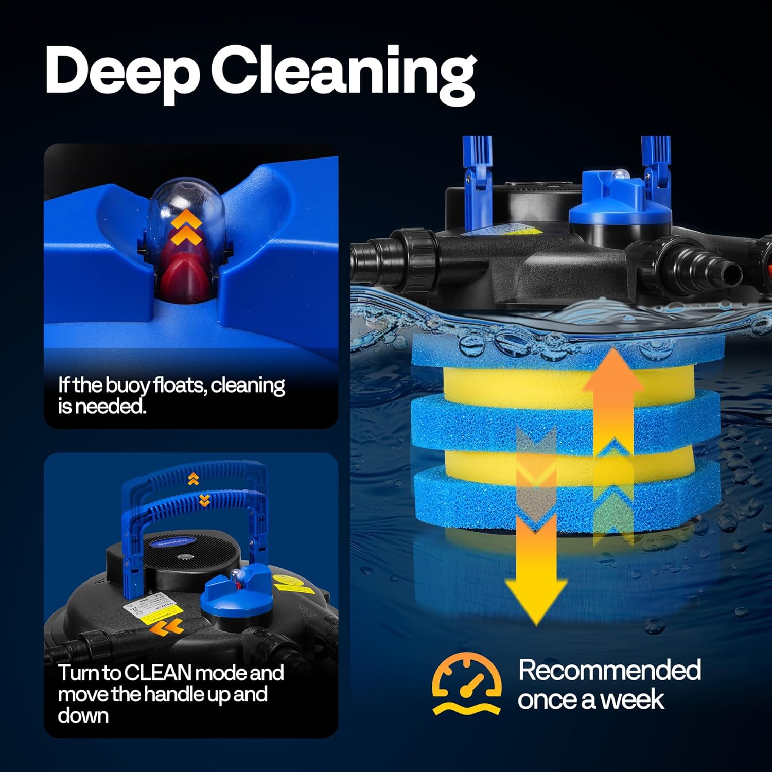 - EASY OPERATION & MAINTENANCE: The function switch allows you to easily switch between FILTER and CLEAN modes; Turn to sewage outlet and repeatedly move the handle up and down until clear water flows from the outlet, which ensures a more thorough cleaning of the filter sponges; When the buoy floats, it’s time to clean it; It is recommended to clean the filter sponges once a week to maintain optimal performance; A separate lamp replacement guide and an extra lamp are included for your convenience