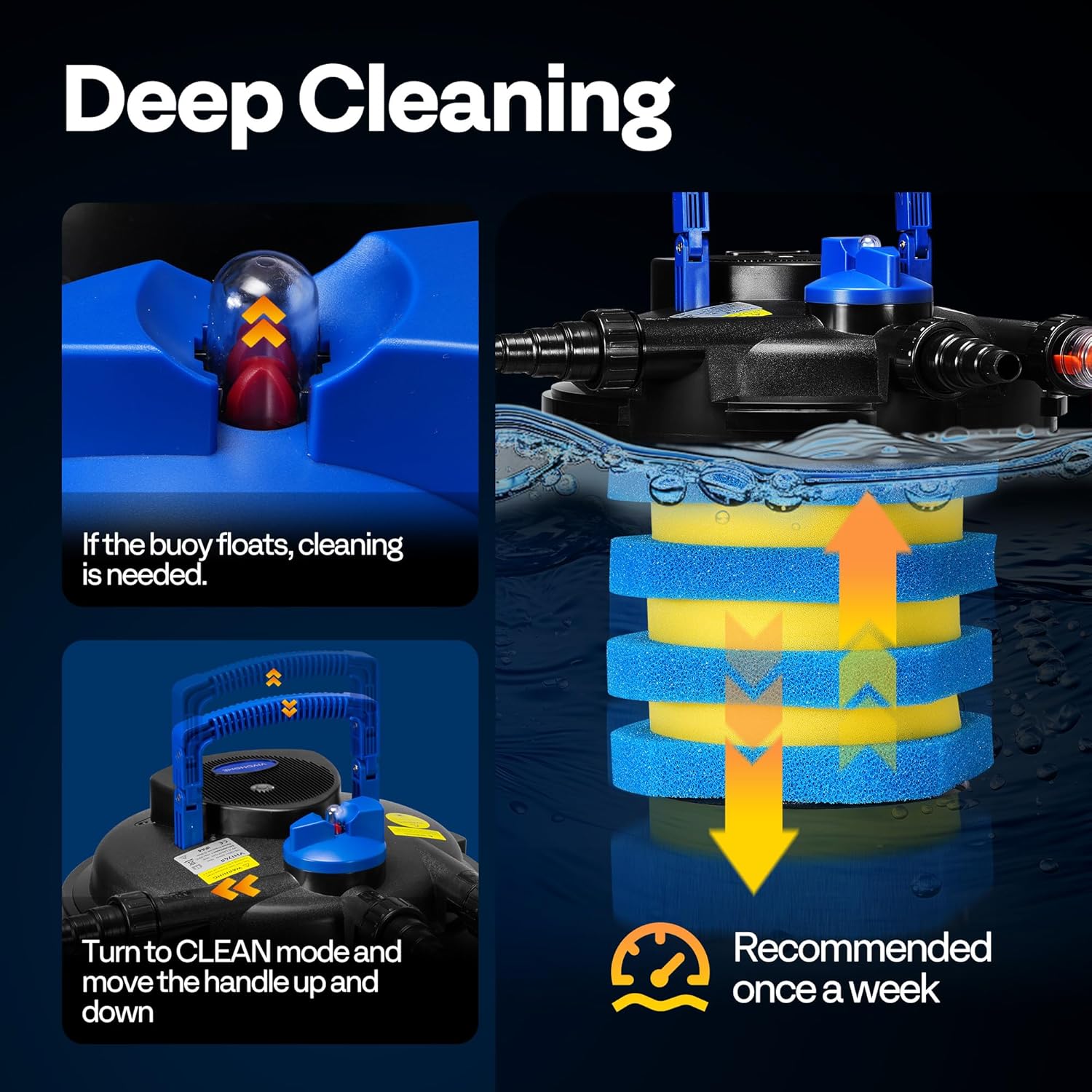 - EASY OPERATION & MAINTENANCE: The function switch allows you to easily switch between FILTER and CLEAN modes; Turn to sewage outlet and repeatedly move the handle up and down until clear water flows from the outlet, which ensures a more thorough cleaning of the filter sponges; When the buoy floats, it’s time to clean it; It is recommended to clean the filter sponges once a week to maintain optimal performance; A separate lamp replacement guide and an extra lamp are included for your convenience