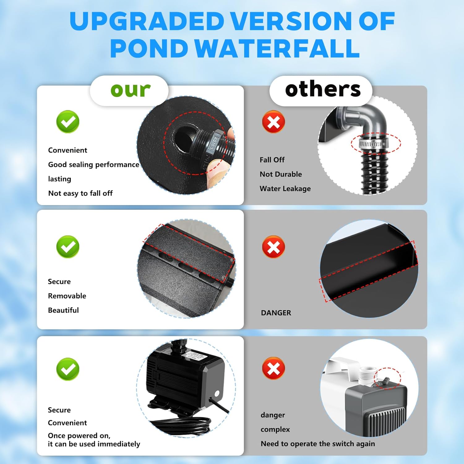- Instant Waterfall Effect:A ready to use water feature solution that quickly creates visual effects of natural streams and waterfalls