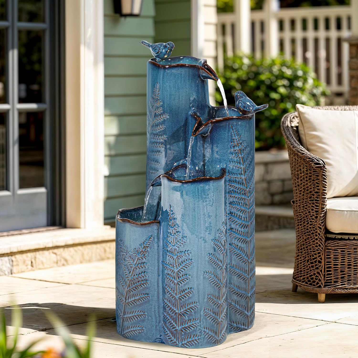 32" Tall Outdoor Fountain, Ceramic Vase Water Fountain withs Lights, 4-Tier Waterfalls with Birds, Tranquil Oasis for Garden Patio Yard Deck Balcony Decor, Tropical Fern, Turquoise Glaze