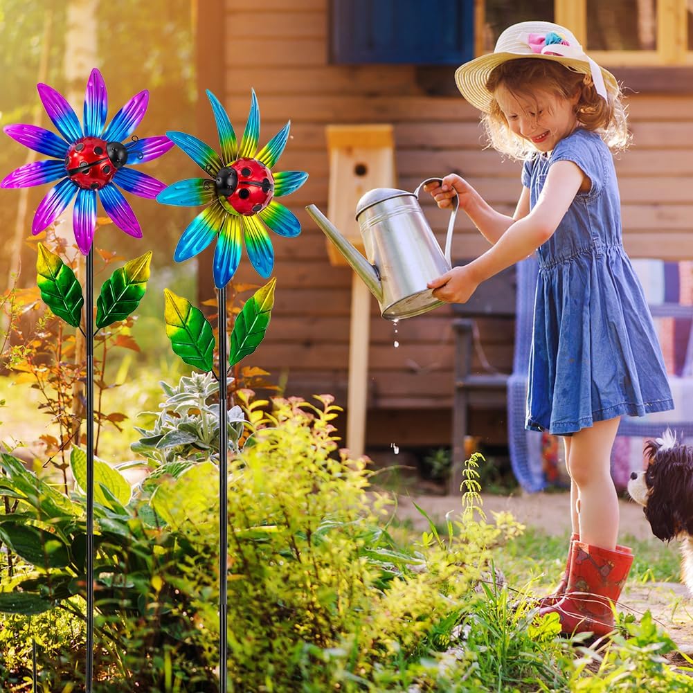 2 Pack Wind Spinner Outdoor,Waterproof Metal Windmill with Ladybug,Pinwheels for Yard and Garden, Flower Wind Sculpture & Spinner for Patio Lawn Decor
