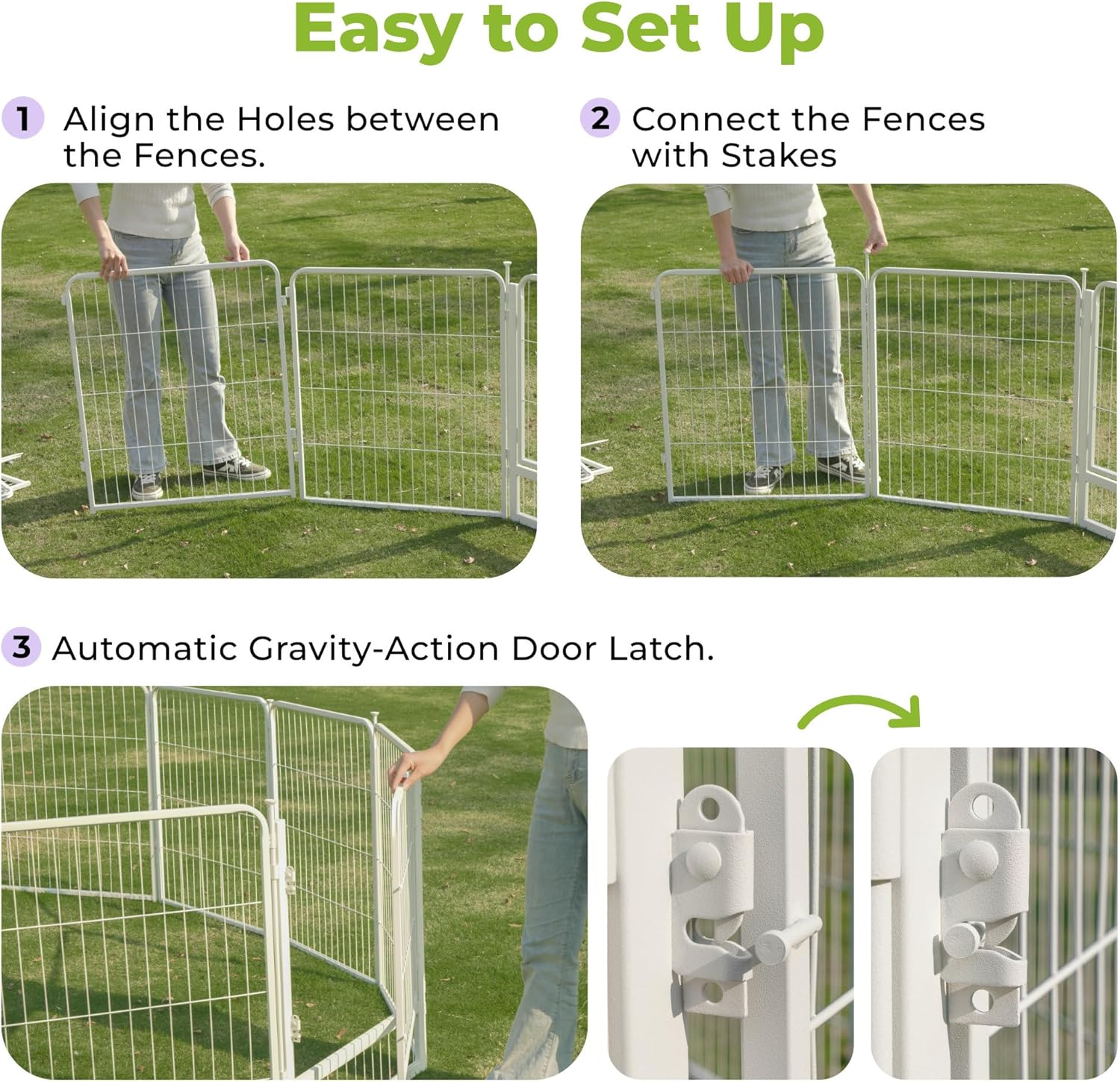 - Easy to Assemble: Say goodbye to complicated assembly! Garden fence with gate could be assembled in just a few minutes without tools, you only need to put the two fence panels facing out and align the rings, and finally insert the pole into the ring to fix it. The pole easily inserts into the soil, providing great stability