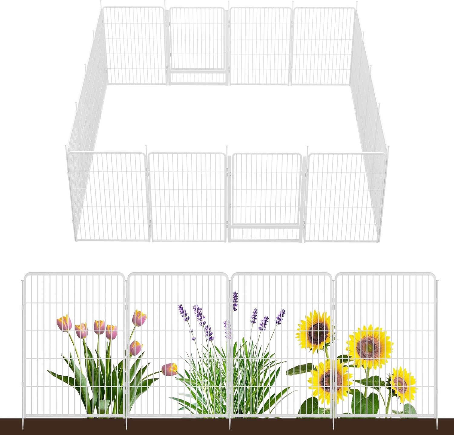 - Easy to Assemble: Say goodbye to complicated assembly! Garden fence with gate could be assembled in just a few minutes without tools, you only need to put the two fence panels facing out and align the rings, and finally insert the pole into the ring to fix it. The pole easily inserts into the soil, providing great stability