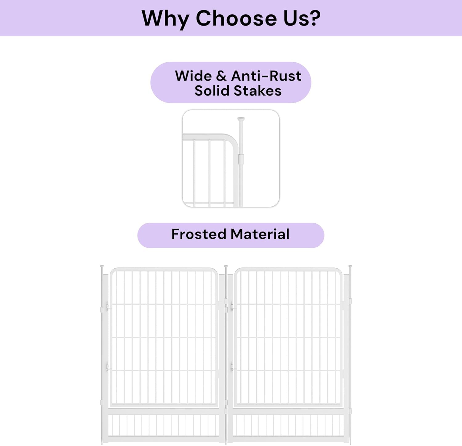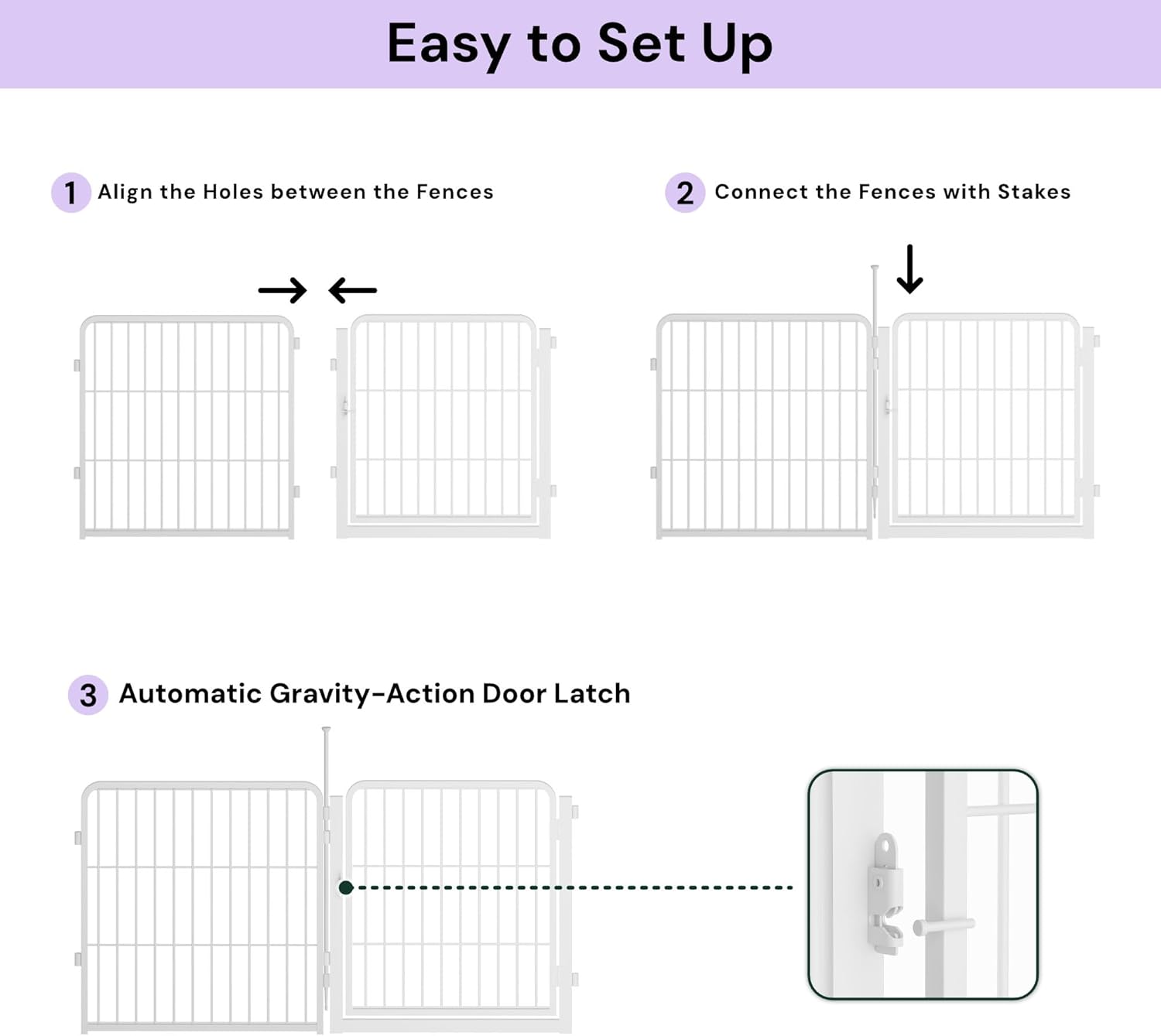 - Easy to Assemble: Say goodbye to complicated assembly! Garden fence with gate could be assembled in just a few minutes without tools, you only need to put the two fence panels facing out and align the rings, and finally insert the pole into the ring to fix it. The pole easily inserts into the soil, providing great stability