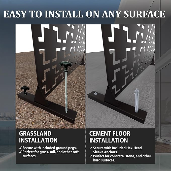 6FT Outdoor Metal Privacy Screen โ Decorative Privacy Fence and Room/Garden Divider, Weather-Resistant Freestanding Panel with Stand, Durable Steel for Patio, Garden, Balcony, or Backyard