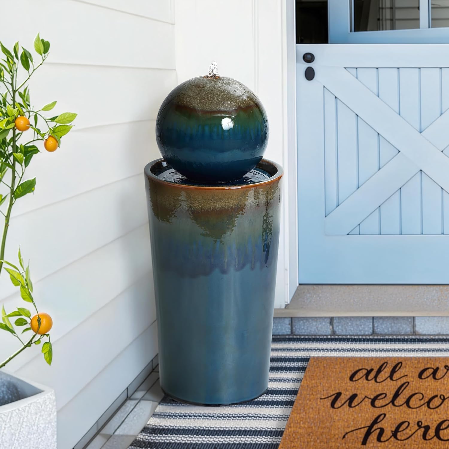 - Elegant Ceramic Design: Featuring a stunning glazed blue finish with a sleek spherical top, this ceramic outdoor water fountain adds a touch of sophistication to any garden, patio, or outdoor space.