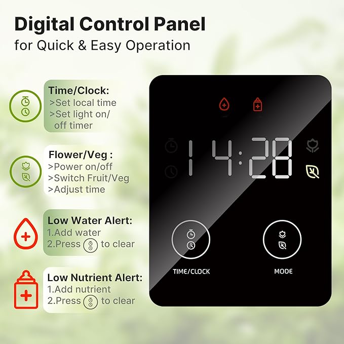 - 【Light Timer & Water Indicator】 This hydroponics growing system kit allows you to set the light start time to suit your unique growing needs. It also features water level indicators to ensure your plants stay healthy and thriving.