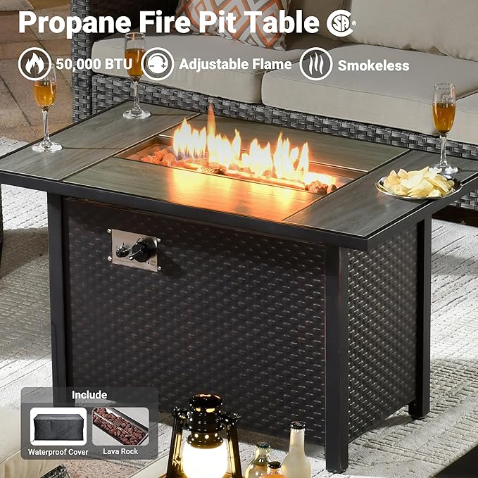 - Outdoor Fire Pit Table: 30 inches square patio gas propane fire table has 55000 BTU powerful heat output with CSA certification. Equipped with a flame adjustment device, the simple switch control panel.