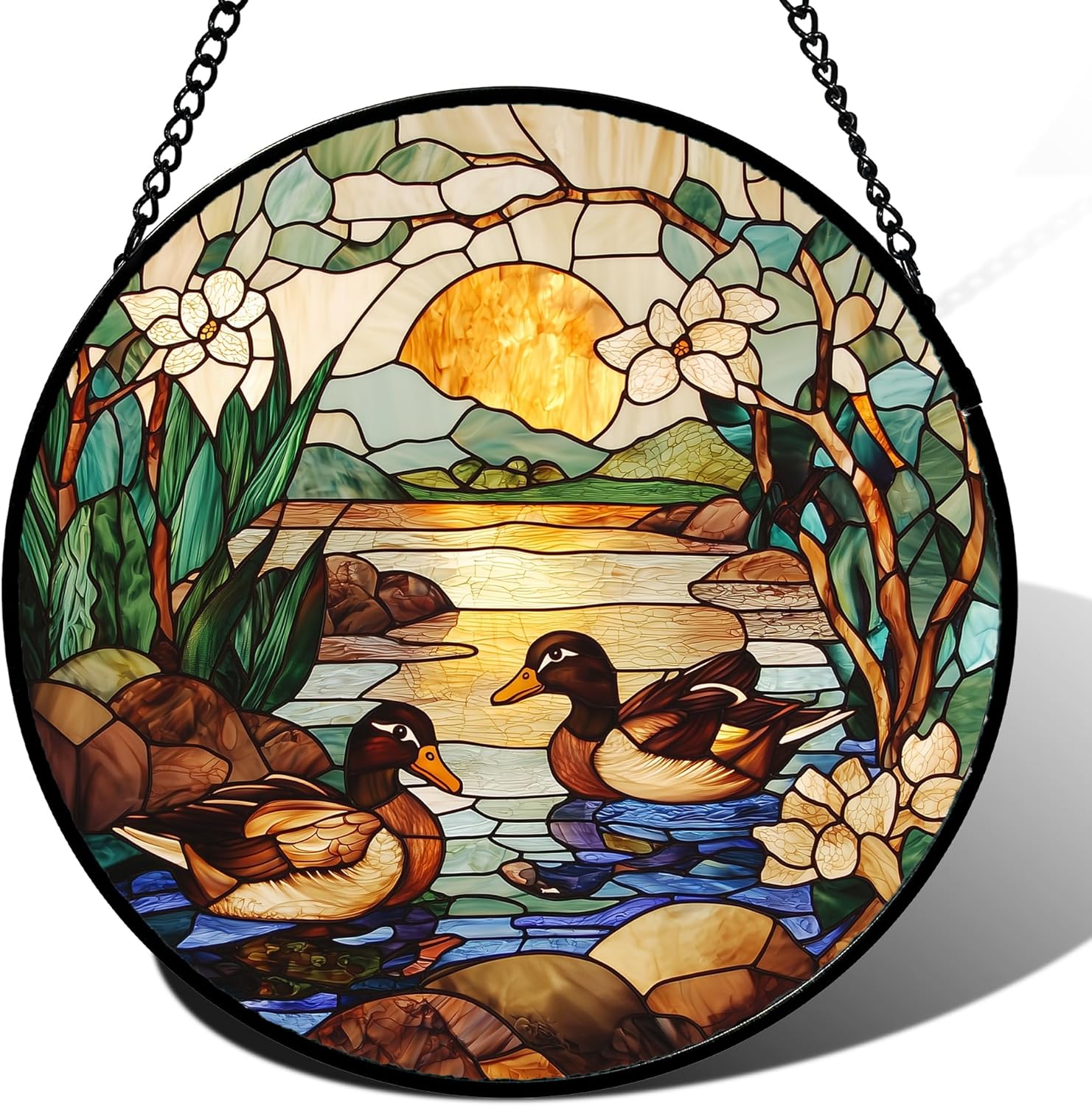 Stained Glass Window Hanging, Ducks in The Pond Sun Catcher for Door Home Decor Landscape Plant Suncatcher Christmas Mother's Day Birthday Gifts for Women Men Mom Nana 9.8 in
