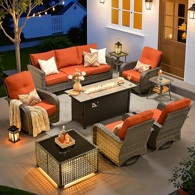 ovios 9 Pieces Patio Furniture Set, Outdoor Wicker Sofa Couch with Rocking Swivel Chairs Fire Pit Table, Modern Deep Seat Rattan Conversation Sets for Porch Deck, Orange Red