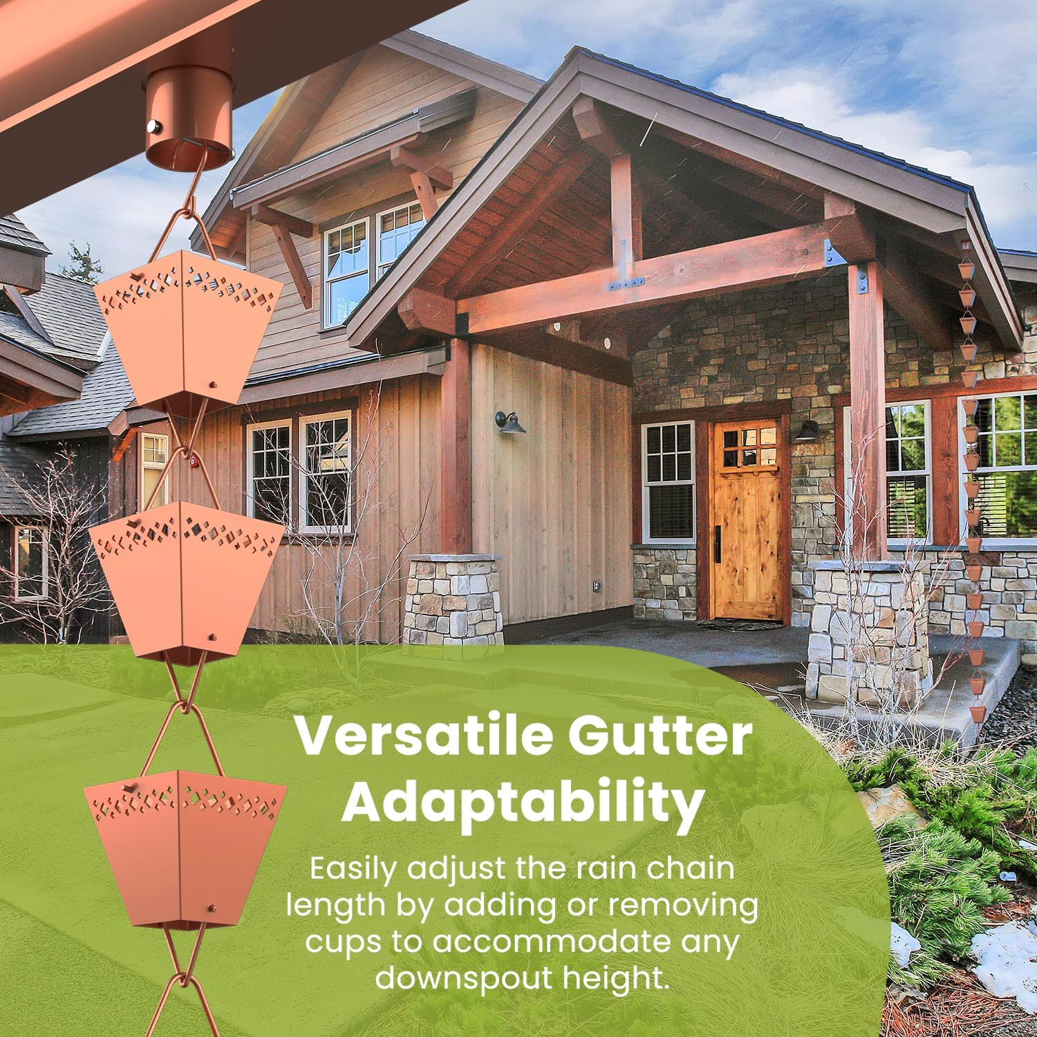 - Adjustable Length: With an adjustable length of up to 10ft, this copper chain rain chime adapts to various gutter heights. The rain chains for gutters for heavy rain design ensures it handles substantial rain flow efficiently and is low maintenance.