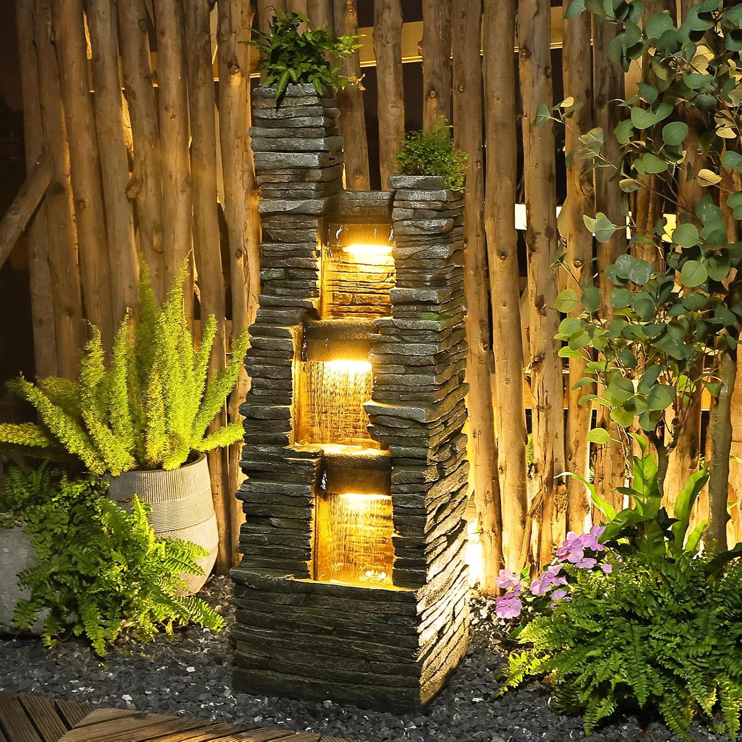 - 【Fountain with Soft-Glow LED Lights】Energy-efficient warm white LED illuminate water streams at night, creating a mesmerizing ambiance for garden dinners or quiet evenings. Making it ideal for creating a relaxing atmosphere as night falls.