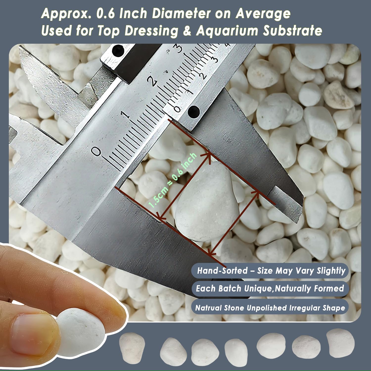 - 【Average 0.6 Inch White Gravel – Ideal Size for Plants & Tanks】 Each piece of the natrual white gravel measures about 0.6 inch, better for succulent top dressing, bonsai, terrariums, and fish tank substrate. 5LB bag can cover 6-8 pots of 6 inches.