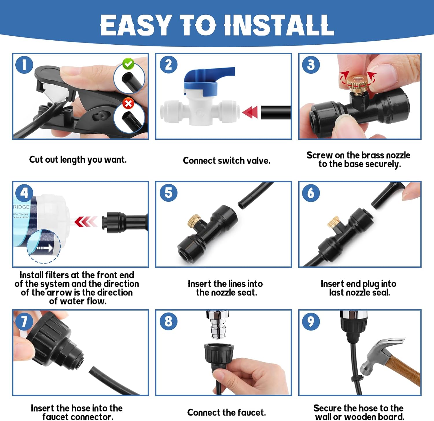 - 【Package Included】Includes 100 Ft 1/4’’ misting Line, 30pcs T-shape atomizing adapters, 30pcs brass misting nozzles, 2pcs PE 3/4" threaded fitting, 2pcs PE universal adapter, 2pcs quick connect tee fitting, 4pcs 90-degree elbows connector, 2pcs coupling fittings, 2pcs shut off valve, 4pcs ends plug, 20pcs zip ties, 30pcs steel nail buckle, 1pcs pipe cutter, 2pcs faucet filter screen,1pcs tube water filter and 1 Teflon tape.