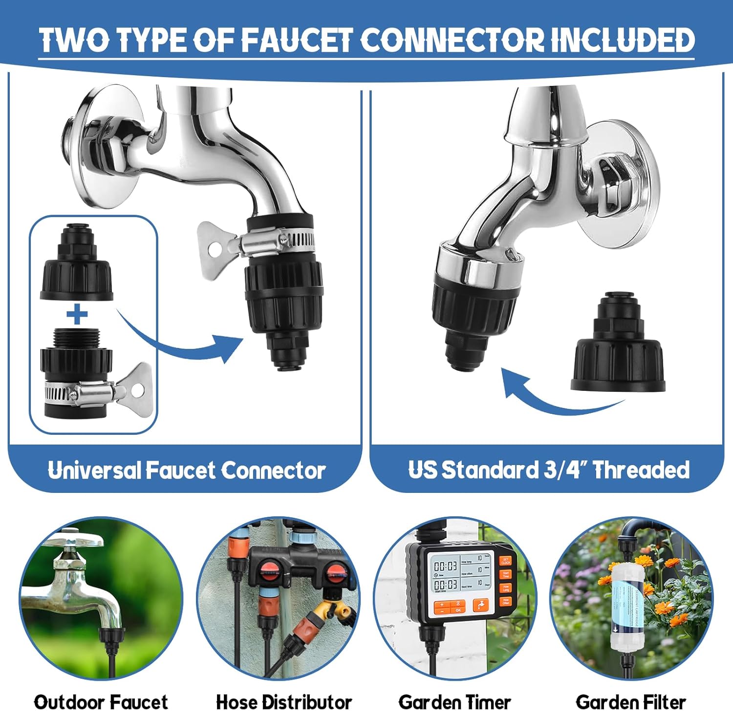 - 【Dual Faucet Connector Options】Our garden mister system features two type of faucet connectors—the US Standard 3/4" threaded fitting and the universal adapter, crafted from high-quality plastic for leak-proof seals and rust-free durability. Perfect for linking to garden timers, hose splitters, or outdoor faucets, ensuring a secure, long-lasting cooling setup.