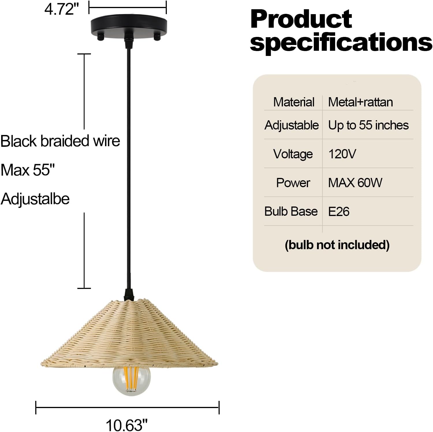 - Boho Woven Pendant Light with Natural Texture:Crafted from natural rattan wicker, this pendant light fixture features a handwoven boho style design that projects intricate shadows, creating a farmhouse or bohemian ambiance. Perfect for kitchen island pendant lights, its 10.63 inch diameter and adjustable 55 inch cord ensure it fits ceiling-to-floor spaces, ideal for dining areas or living rooms.