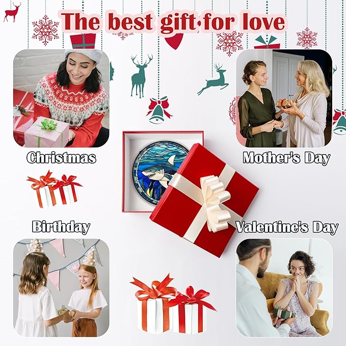 Stained Glass Suncatcher, Blue Ocean Big Shark Sun Catcher Waterweed Stain Glass Window Hanging Decoration Mother's Day Birthday Gifts for Women Men Mom Nana 7.8 in