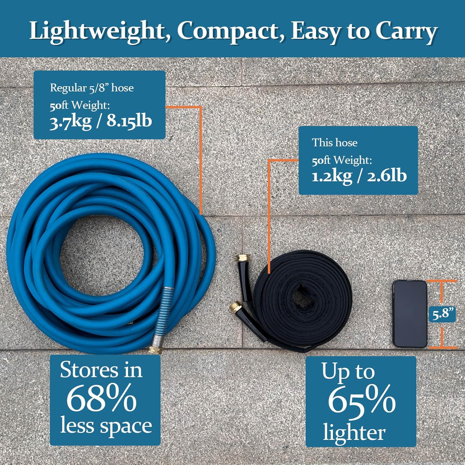 - [ Lightweight, Compact, Easy to Carry ] Up to 65% lighter and 68% less storage space than conventional garden hoses. This water Hose is extra flexible, lightweight and compact for simple storage, perfect for garden, RV and marine use. Whether moving through different parts of the garden or switching between locations, handling them is effortless.