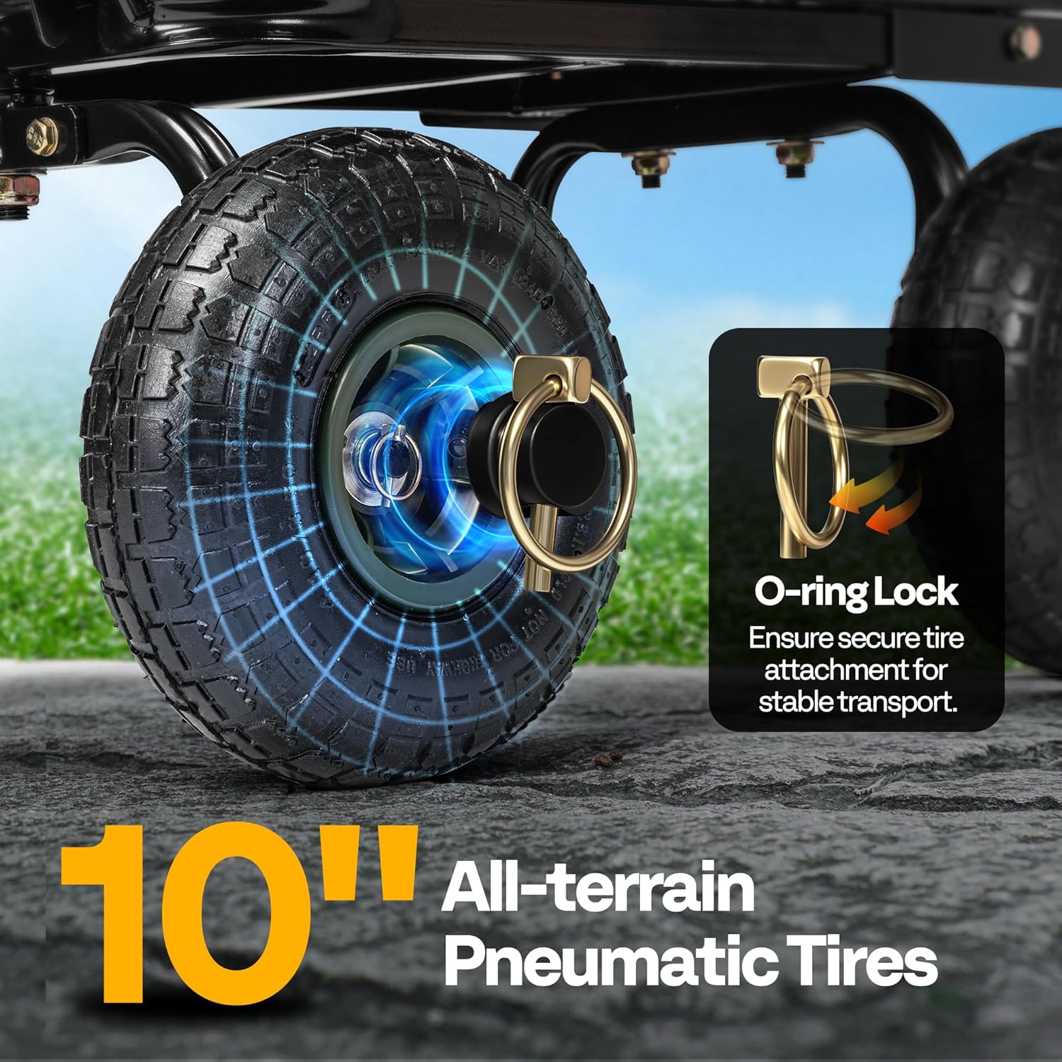 - All-Terrain Pneumatic Tires: 10" pneumatic tires provide natural shock absorption and smoother rolling, reducing impact and effort when moving heavy loads; The deep tread pattern delivers superior traction and shock absorption on grass, gravel, or slope; The O-ring lock ensures secure tire attachment for stable transport