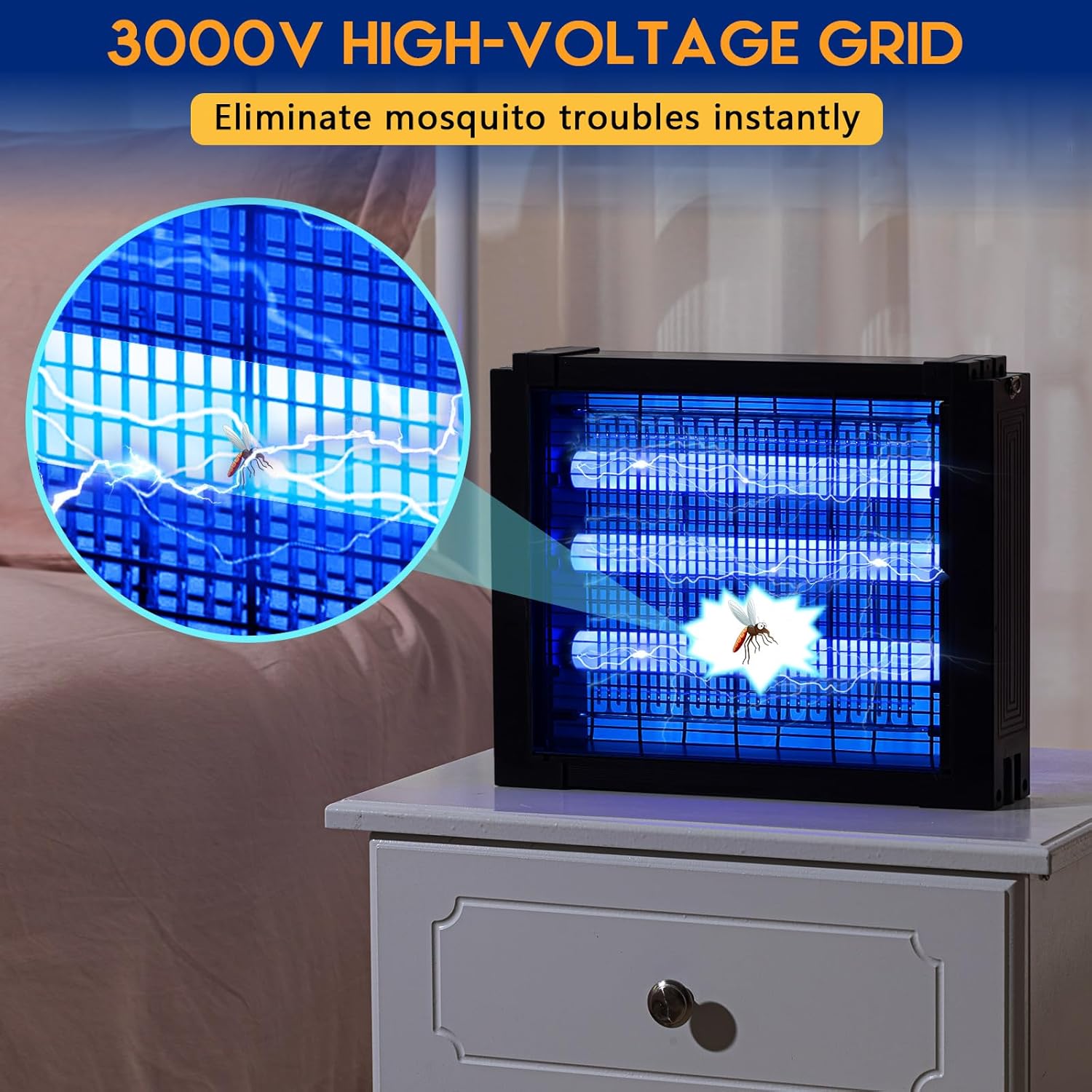 - High Performing 3000v Device: the mosquito zapper comes with a 3000V high-voltage grid; The bright blue-purple light emitted by the device instantly attracts mosquitoes and other flying insects; It provides a safe solution to keep your environment bug-free