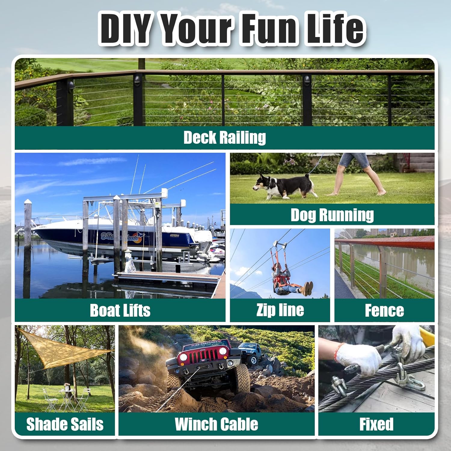 - Applicable scenarios: 1"/4 steel cable is an ideal choice for outdoor, high-altitude zip lines, boat lifts, garden railings, and industrial or buildings.