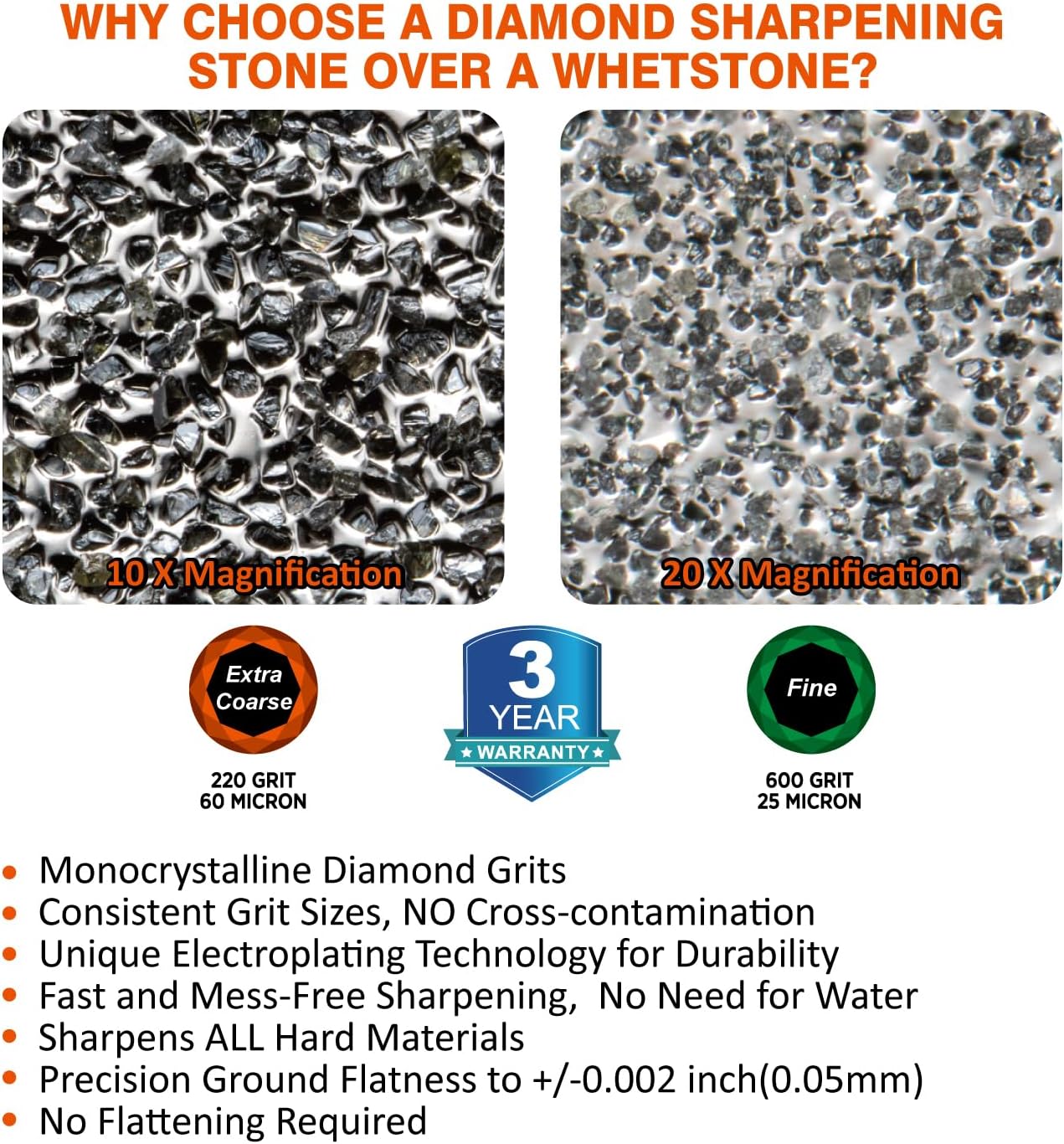 - ๐๐ก๐ฒ ๐๐ก๐จ๐จ๐ฌ๐ ๐๐ข๐๐ฆ๐จ๐ง๐ ๐๐ฏ๐๐ซ ๐๐ก๐๐ญ๐ฌ๐ญ๐จ๐ง๐๐ฌ: Diamond sharpens even the hardest steels, including super steels like CPM-series, M390, and Elmax. Unlike traditional whetstones, diamond sharpening plates stay flat, require no lapping, work dry without mess, and deliver more efficient, consistent results.