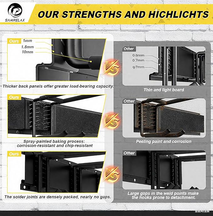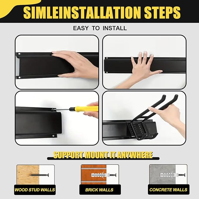 - 【Multifunctional】 Garage racks for storage can be installed in garages to hang garden tools and folding chairs; heavy duty garage wall hooks can be installed in gyms to store dumbbells and yoga mats; garden tool storage can be installed in repair rooms to hang wrenches, chainsaws, and other equipment; garage wall organizer can be installed on balconies or in bedrooms to hang everyday cleaning tools.