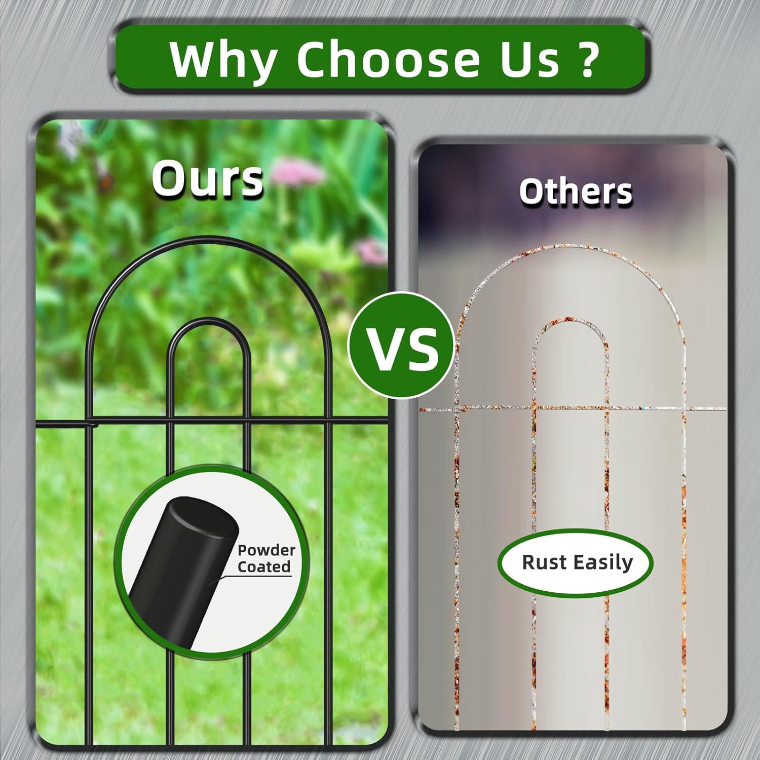 - The decorative garden fences is made of high quality metal, durable black powder coated to prevent rust. This small fence for garden is also very convenient and practical in terms of practicality. Outdoor fencing for yard can not only protect flowers and plants, but also the arched design will become the best decorative element in your garden, metal fence panels adds new scenery to our garden.