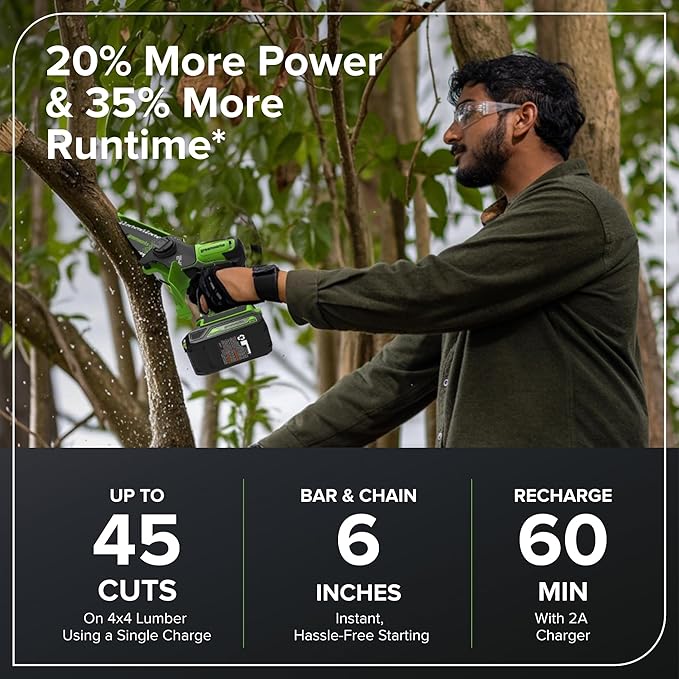 - 6" Precision Cutting Power with Auto-Oiler Effortlessly trim branches, cut firewood, and prune trees with our self-lubricating system. The automatic oiler keeps your 6" bar and chain perfectly lubricated for smoother cuts and longer tool life – ideal for yard maintenance, camping, and outdoor adventures.