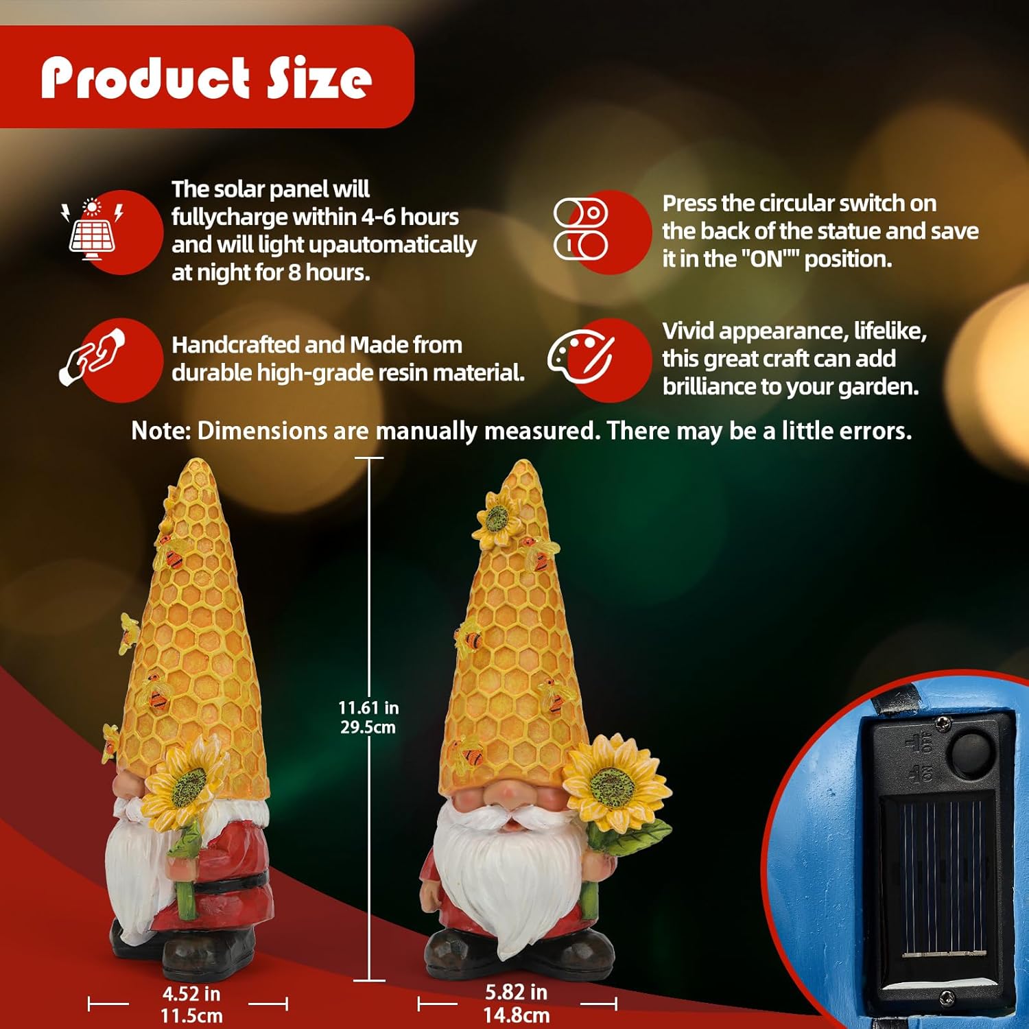 - 【Build Your Modern Garden】:Solar yellow bee gnome statue is 5.82"/14.8cm L x 4.52"/11.5cm W x 11.61"/29.5cm H. Its ideal size makes it a versatile addition to patios, porches, gardens, or tabletops, adding charm without taking up too much space. Note: Dimensions are manually measured. There may be a little errors.