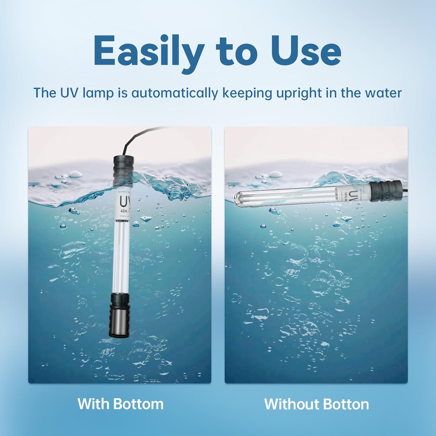 - Built to Last: The sleeve of UV pond filter is Crafted from ultra-clear, high-purity quartz material. this specially glass sleeve not only optimizes UV light for fish tank transmission for enhanced UV disinfection efficiency, but also survives deep-water pressure and hot-to-cold shocks for reduces the risk of cracking. Always disconnect power before maintenance, handling, or relocation.