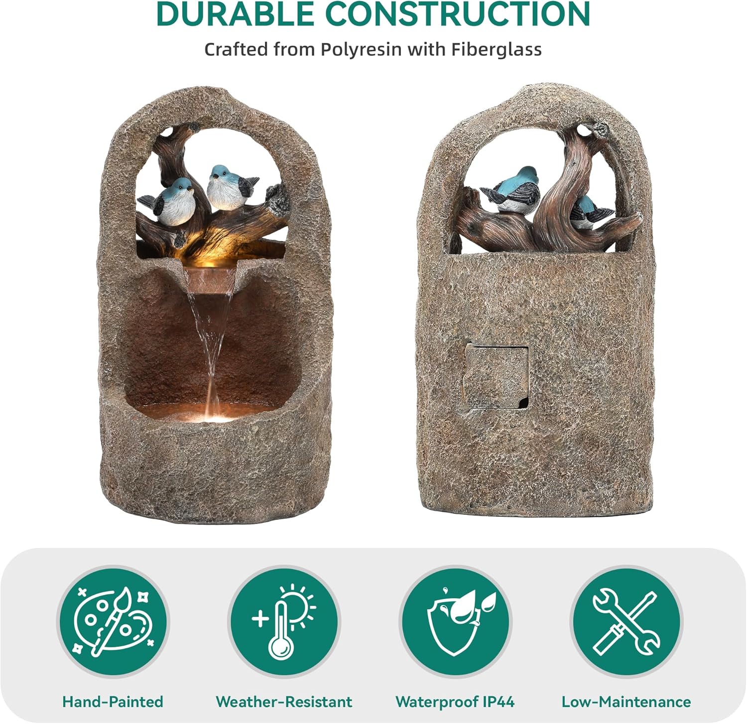 27" Outdoor Water Fountain with LED Lights,2-Tier Bird Natural Zen Garden Fountain, Relaxing Waterfall Floor, Yard, Porch or Deck Decor, Whether-Resistant, Faux Granite Texture