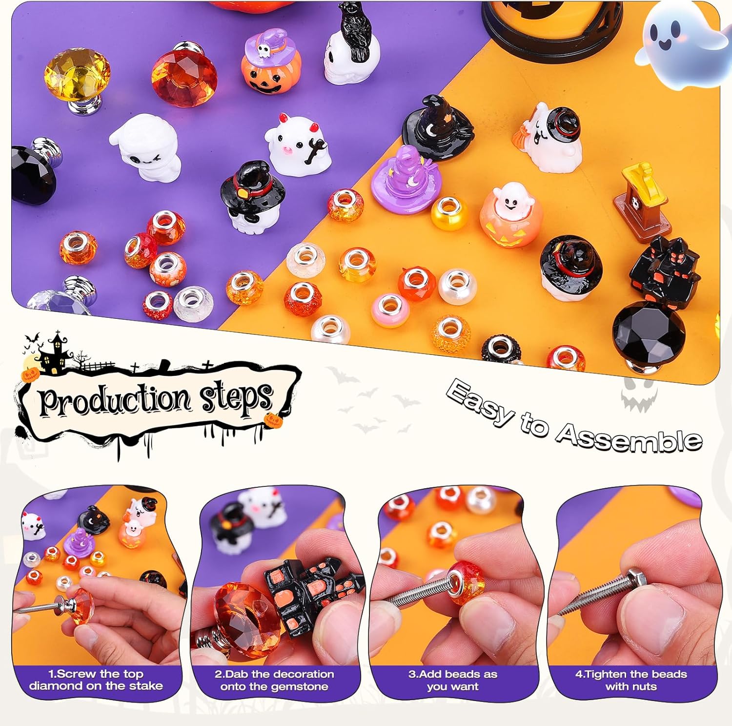 - Package Included: Halloween bead pile contains a variety of Halloween series elements, with colorful beads to help your garden add more style. You will receive a total of 358 products, including 12 crystal stoppers, 6 10-inch threaded rods, 6 12-inch threaded rods,240 beads, 12 Halloween decorations, 50 different Halloween pendants,12 screw caps, 20 glue dots.