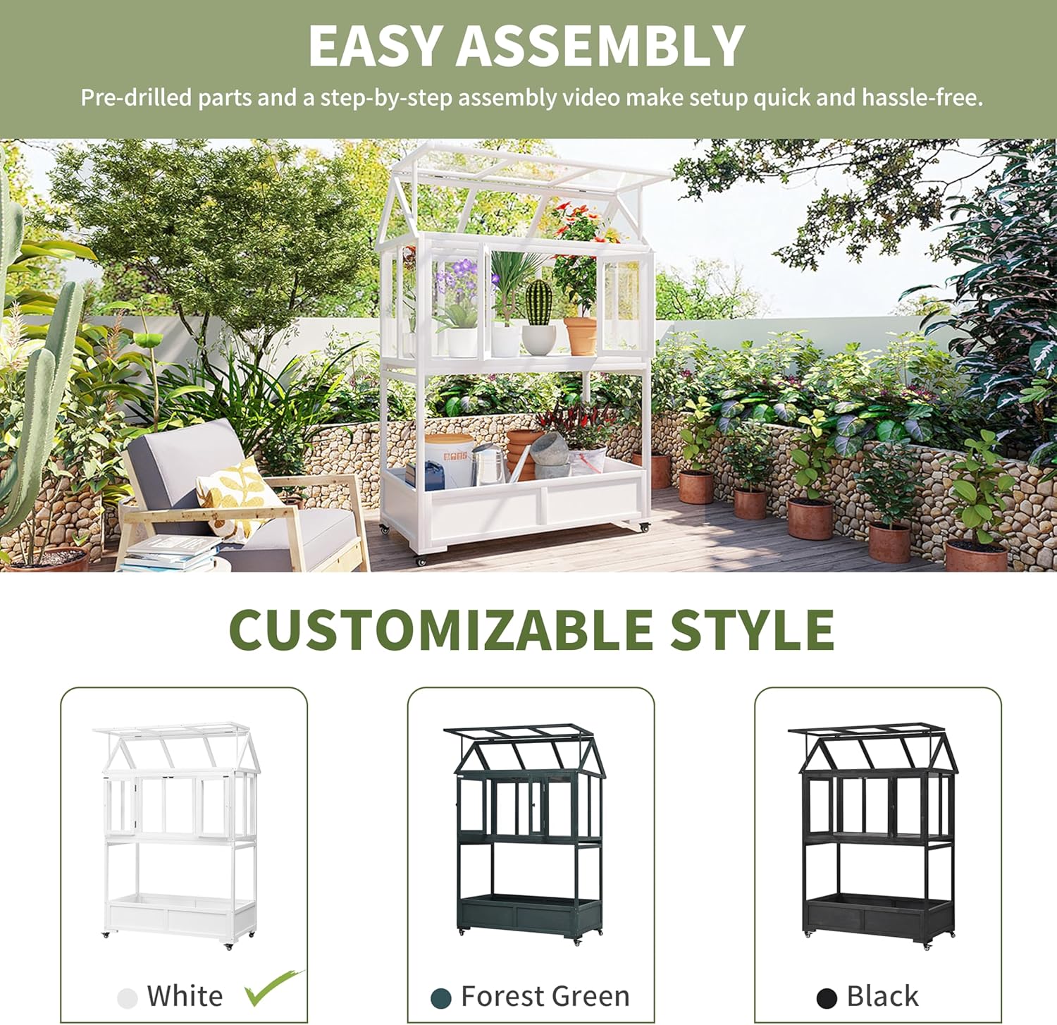 - Easy Assembly & Customizable Style: Quick & hassle-free setup with pre-drilled parts & a step-by-step assembly video. Choose from 3 elegant colors to match your outdoor décor. Ergonomic round handles & tool-free roof adjustments make daily use a breeze.