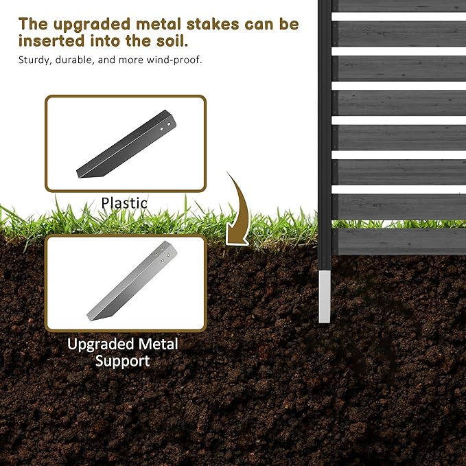 - DIMENSIONS - Once assembled, your wood outdoor privacy screens will measure 60in H x 40.16in W(on ground)The dimensions of boards are: 4.72"W×35.43"L, and the gap between boards is 1.18 ". In addition, this privacy wooden screen is equipped with 9.06 "upgraded metal stakes, which are suitable for hard ground and soil for extra privacy around your patio, deck, garden, or backyard.