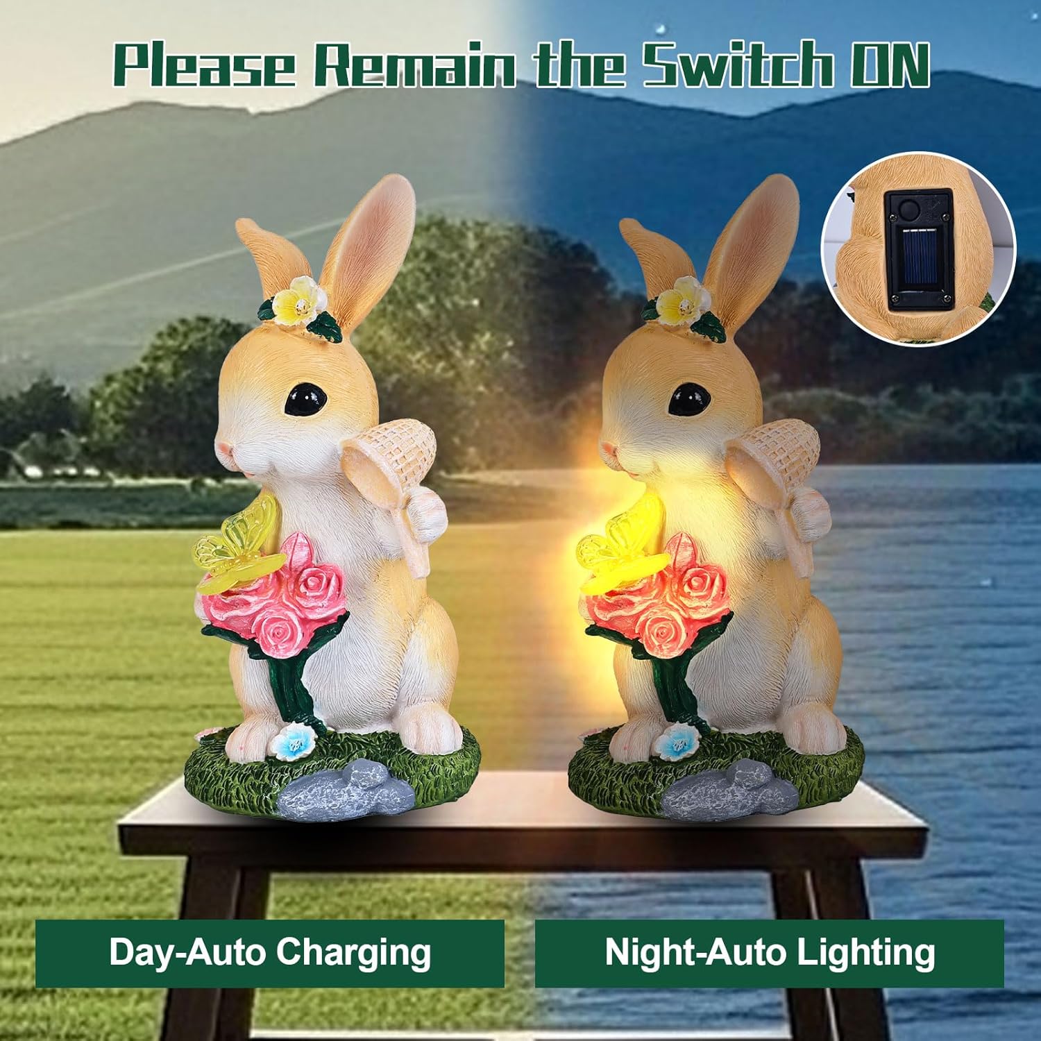 Garden Statues Rabbit with Solar Light,Bunny Outdoor Garden Decor Ornaments for Patio Yard Art,Birthday Easter House Warming Garden Gift for Women Mom,Resin Animal Figurine with Wider Base