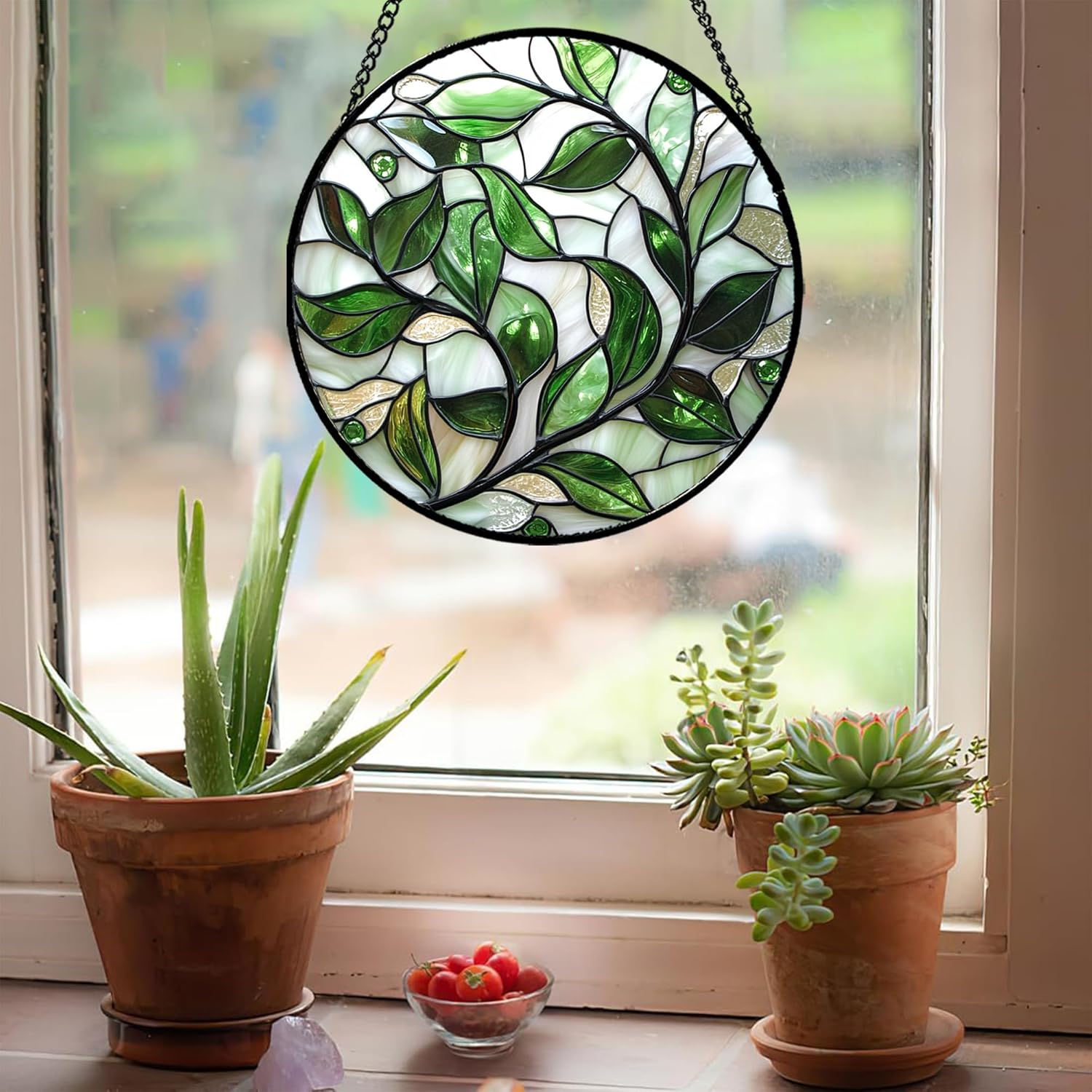 Stained Glass Window Hanging - White Green Leaves Suncatcher for Doors Window Home Plant Sun Catchers Decor Christmas Mother's Day Birthday Gifts for Teacher Women Men Mom Nana 9.8 in