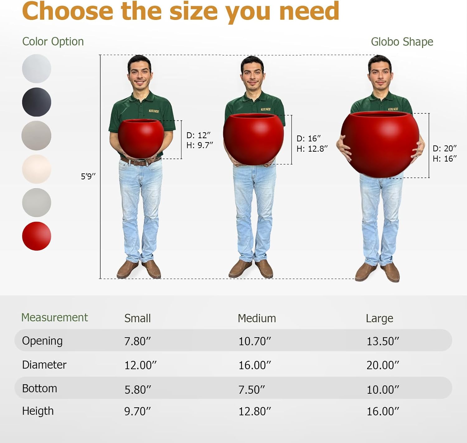 - Small Planter: 12" D x 9.7" H (7.8" Pot Opening)