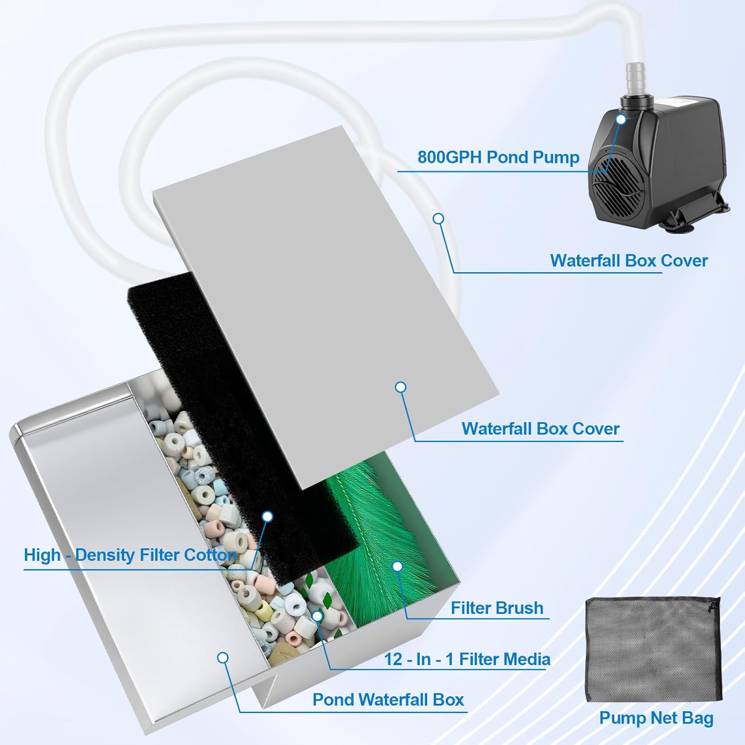- Pump Guard Pre-Filter Cage: Your pond waterfall kit's first line of defense. This durable outer cage blocks leaves, twigs, and large debris from entering and clogging the pump intake. This simple feature drastically reduces cleaning frequency and protects the pump's motor, significantly extending its operational life.