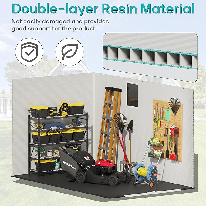 - Durable Double-Layer Resin Construction: This heavy-duty outdoor storage shed features extra-thick double-layer resin panels, a floor, and bright windows for natural lighting. Designed to resist bending, punctures, and harsh weather for long-lasting use.